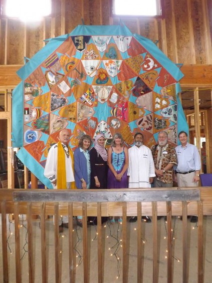 Pictured with the Peace Quilt (left to right): His Excellency Reverend Patrick McCollum, Ruth Broyde Sharone, Dina Shehata, M.A., Reverend Laura George, J.D., Guruji Sri Yogacharya Arun Kumarji, Glen T. Martin, Ph.D., and Reverend Don Lanksy