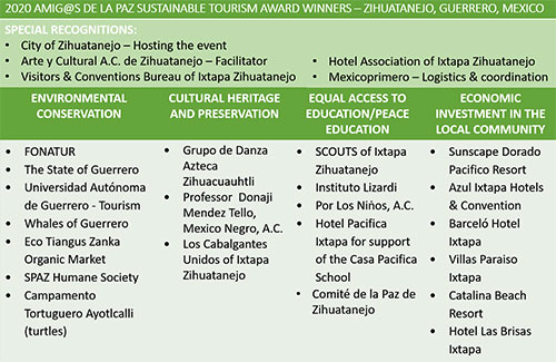Ixtapa-Zihuantanejo became the first city in Mexico and the world to launch the Amigo de la Paz Peace and Sustainable Tourism Program. The Amigo de la Paz Tourism Program is designed to recognize cities, companies, and civic organizations that support ecology, a sustainable environment, quality education, enhancement of cultural heritage, and other UN Sustainable Development goals. Hotels, restaurants, schools and businesses have signed up to participate in this groundbreaking campaign to spread peace through tourism highlighting the message Que La Paz Prevalezca en La Tierra – May Peace Prevail On Earth.