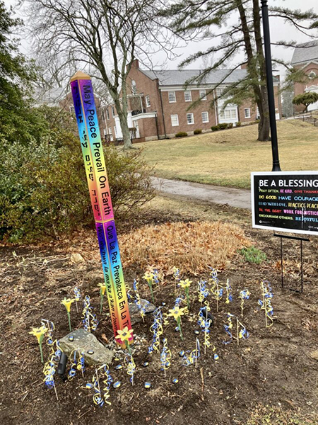The Peace Pole, on the front lawn of Storrs Congregational Church, Storrs, Conn., is surrounded by blue and yellow ribbons for the people of Ukraine.