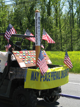 The year the message “May Peace Prevail On Earth” was included in the Tri-Town Memorial Day Parade for Ulster County New York. The parade included the Townships of Plattekill, Modena and Wallkill. The parade would end at the Thomas Felton Park. The Thomas Felton Park is the site where a Peace Pole dedication will take place in September 2008 at the 2008 Plattekill Day event.