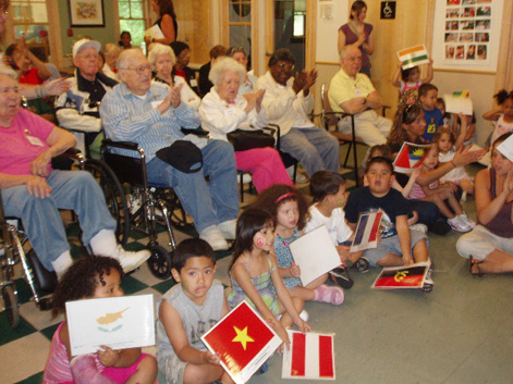 June 27, 2008 marked the annual Peace Pole re-dedication at the intergenerational daycare center called Mount Kisco Daycare/My Second Home in Mount Kisco, NY. Although a light drizzle drove the festivities indoors, participants from toddlers carrying flags to seniors reading inspirational quotes all enjoyed the focus on peace.