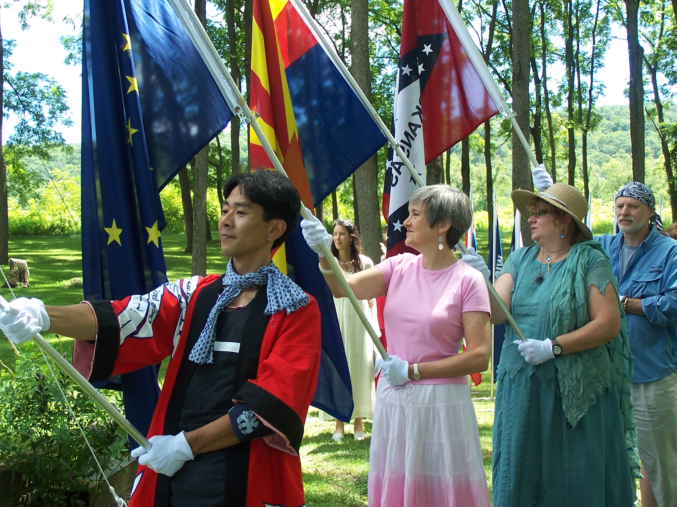 Keizo Aoi, Deborah Moldow and Tonia Shoumatoff participate in the United States of America Flag Ceremony.