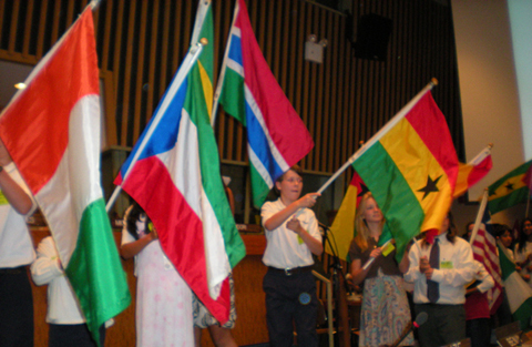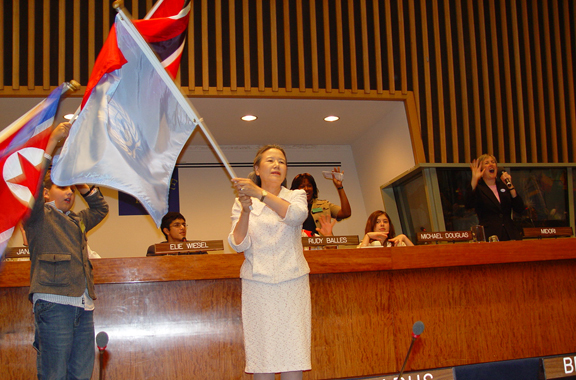 Everyone enjoyed the grand finale, an inspiring World Peace Flag Ceremony. Students carried the flags of the Member States, while those still seated read along with the country list. In between regions, everyone chanted, “May Peace Prevail on Earth,” which was also displayed on the giant screens with regional maps. Mrs. Ban Soon-taek, wife of the Secretary-General, graciously came forward to wave the flag of the United Nations for the joyful finish. This colorful ceremony provided a perfect close to the event, honoring the spirit of the United Nations by sending a heartfelt message of peace around the world.