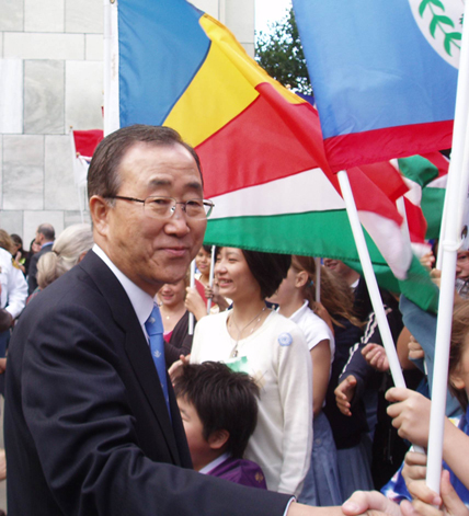 Because September 21st fell on a Sunday this year, the UN observance was held on Friday, September 19th. The beautiful autumn day began with Secretary-General Ban Ki-moon ringing the Peace Bell in the UN Garden, surrounded by celebrity Messengers of Peace Michael Douglas, Jane Goodall, Midori Goto, and Elie Wiesel. Children raised the flags of all 192 UN Member States in a glorious display of the color and diversity of the nations of the world.