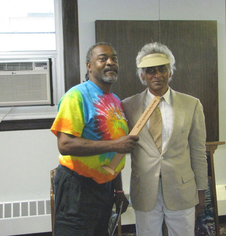 June-2008 Peace Representative, of The World Peace Prayer Society, Melvin Giles presents a desktop Peace Pole to Dr. Gangadeen at the Creating a Compassionate Democracy Conference.