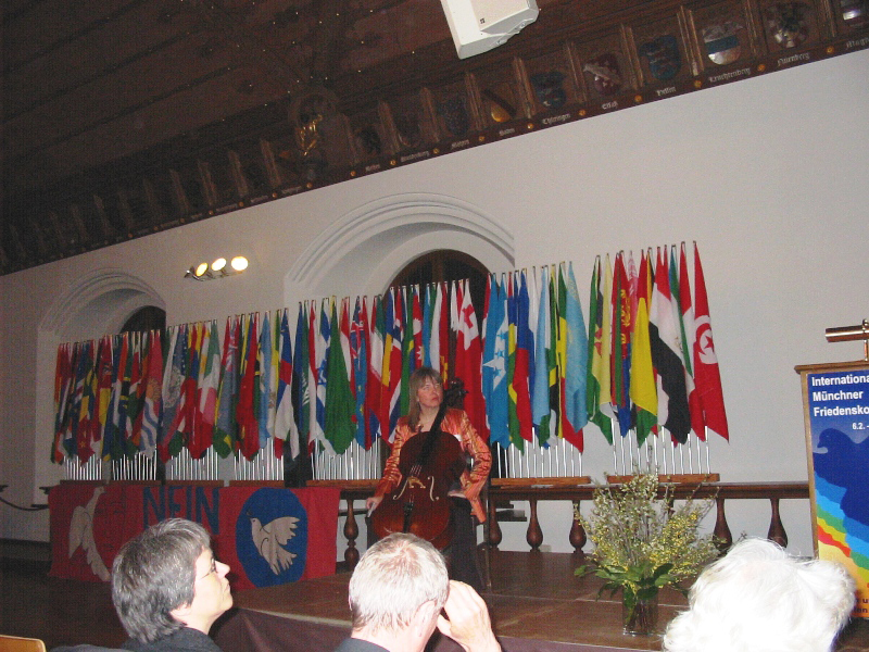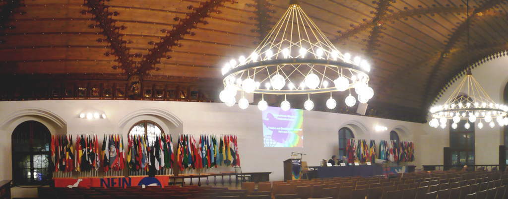 February 6, 2008 WPPS Flags serve as colorful backdrop for the Munich Peace Conference held in the Old Town Hall in Munich, Germany.The conference was well attended by citizens, the major and keynote speakers, such as Mr. Jacob von Uexküll, who initiated the “Right Livelihood Award” many hears ago, currently known as the “Alternative Nobel Prize.”Mini Peace Poles and other items were offered to the attendees to promote the message, May peace Prevail On Earth!