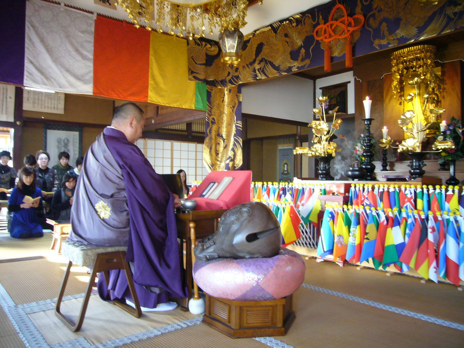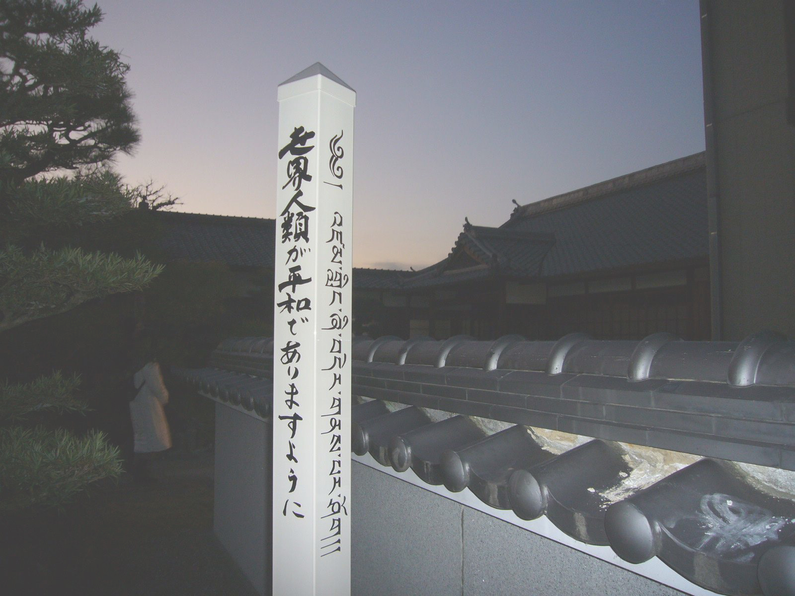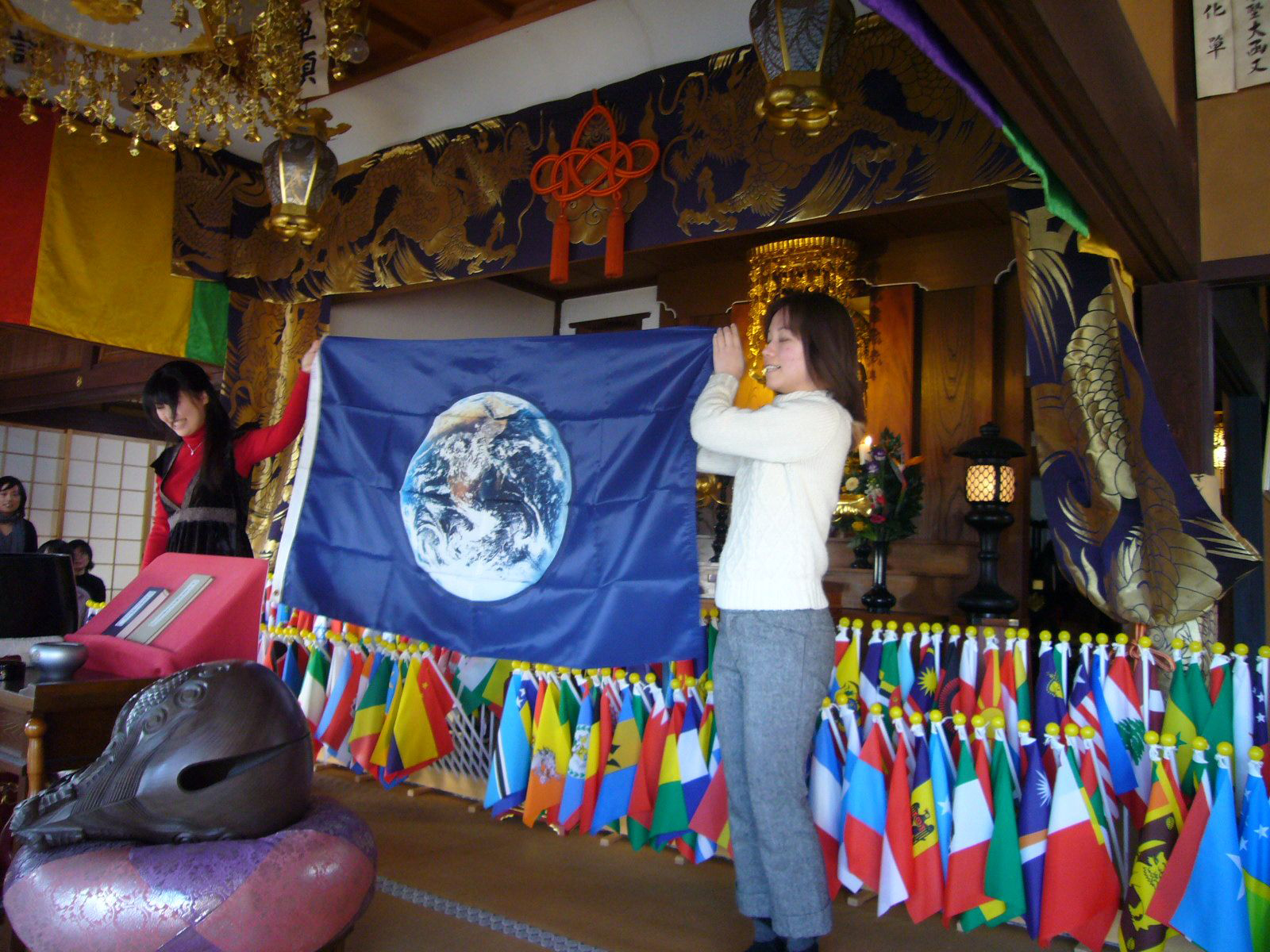 The World Peace Prayer and Flag Ceremony was held in the main room of this Temple and prayers for peace were offered to the Buddha. The message, May Peace Prevail On Earth, is inscribed on the Peace Pole in four languages: Japanese, English, Sanskrit and Hindi
