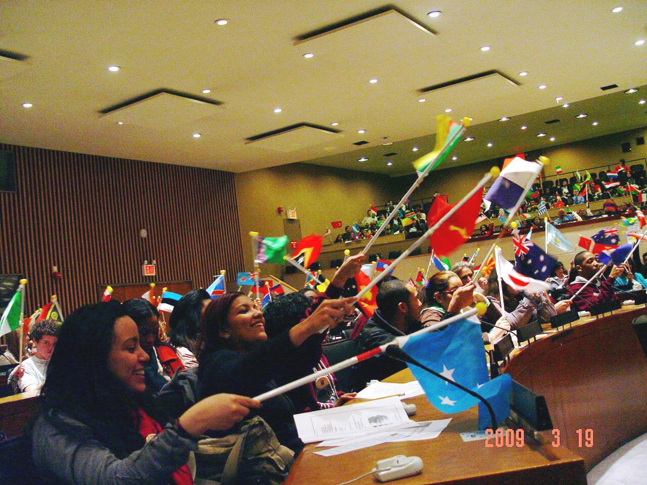500 school children from fourth grade to high school filled a large conference room and found the flag of one of the UN Member States at their seat. They were given permission to wave the flags every time they heard “May Peace Prevail on Earth” which quickly became a theme of the 90-minute program.