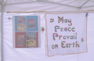 For many years I have created a space within the little tent for hanging some peace banners with Message, May Peace Prevail On Earth!