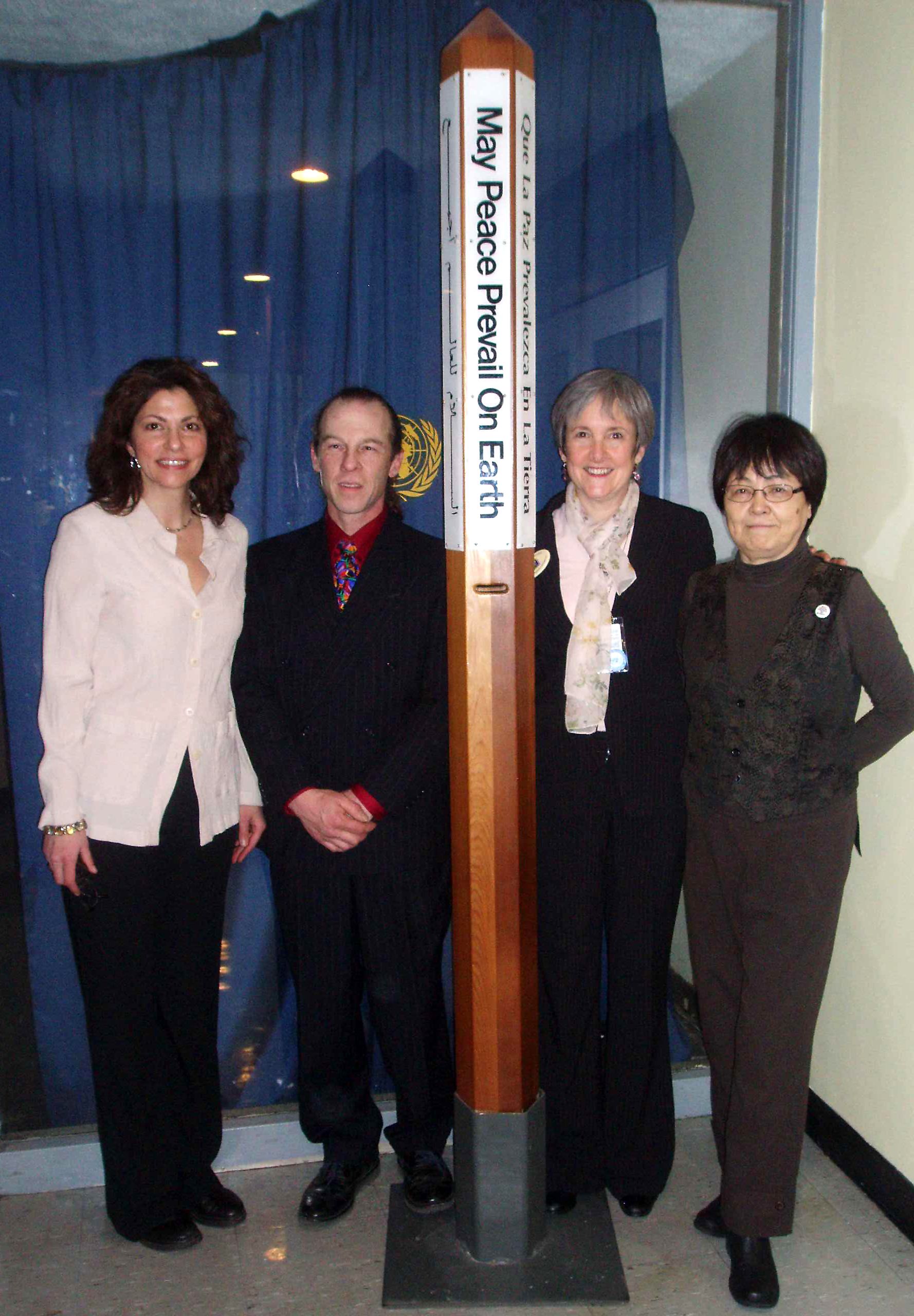 In 2002, the Society acknowledged this very special partnership by presenting the UN Department of Public Information with a six-sided Peace Pole with the message “May Peace Prevail On Earth” in the six official languages of the United Nations: Arabic, Chinese, English, French, Russian and Spanish. This Peace Pole was constructed with a slot so that visitors to the UN could insert their own prayers and messages for peace. The Peace Pole accepted messages at the tour desk in the center of the UN headquarters lobby for almost two years, an unprecedented amount of time for any unofficial object to be on display!