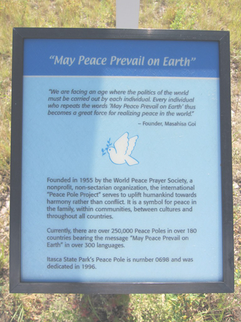 The Peace Pole planted in Itasca State Park was dedicated in 1996 and was recently visited again by some members of The World Peace Prayer Society.