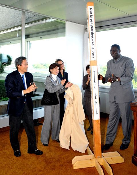 September-2009 Mr. Hiroo Saionji, President and Mrs. Masami Saionji, Chairperson of The World Peace Prayer Society presented a Peace Pole to International Labor Office( ILO) in Geneva-Switzerland.