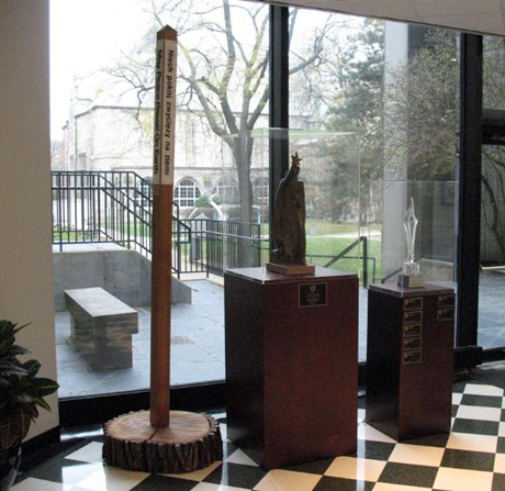 A 4-sided Peace Pole planted in a tree cross section, located in the Library Link, which can be found on the first floor between the the Library and Lewis Hall on the campus.