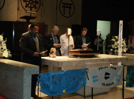 Sunday, May 2nd was a day to call for disarmament in New York City, while world leaders gathered at the United Nations for the Nuclear Non-Proliferation Treaty (NPT) Review Conference. Events began at 12 noon with AN INTERFAITH CONVOCATION for the Abolition of Nuclear Weapons at the chapel of the Church Center for the United Nations. Dignitaries representing many faith traditions included the Most Rev. Katherine Jefferts Schiori, Presiding Bishop of the Episcopal Church. WPPS UN Representative Deborah Moldow was invited to lead both a hymn and a finale of “Let There Be Peace on Earth and Let It Begin With Me.” A Peace Pole was prominently placed at the altar by organizer Mark Johnson of the Fellowship of Reconciliation. Deborah was later seen leading the congregation in saying “May Peace Prevail on Earth” on PBS television’s “Religion and Ethics Newsweekly.”