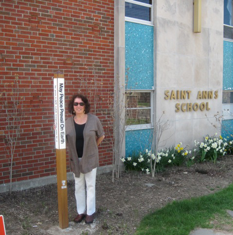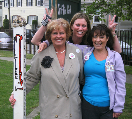 June-2010 Linda Hennesey (Healthfirst) and Brenda Viverios (BMC Healthnet) at Peace Pole in Griffin Park in Fall River, Massachusetts. Both agencies are planting Peace Poles as part of the Fall…