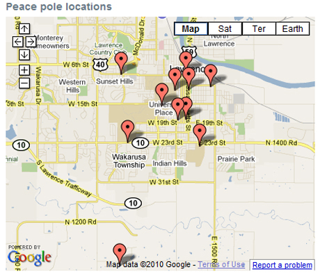 Schultz has been involved in nearly every Peace Pole “planting” in Lawrence and has seen the Peace Poles in several countries during her travels. She’s worked closely with Judy Carman of Lecompton, who helped bring the idea of Peace Poles to Lawrence 10 years ago with the planting of the city’s first pole at Unity Church of Lawrence, then in North Lawrence and now at 900 Madeline Lane. Now, Carman theorizes, Lawrence may have more poles than any other its size. Beth Schultz and Judy Carman are the Lawrence, KS, co-peace representatives for the World Peace Prayer Society.