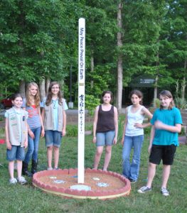 The girls white stained a pole donated by RC Goodwyn & sons (a local lumber company) and nailed on plates, bearing the message, “May Peace Prevail On Earth” in English, Spanish, Hebrew, French, Japanese, Chinese, German, Korean and Braille.