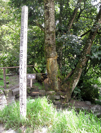 The first Peace Pole we saw was at Machu Picchu in Peru — the 15th-century Inca City. It is a sacred city carved into a sacred landscape. A place where the wafting morning clouds create an instant connection to the power of spirit and the beauty of nature, or “Pachamama” (Mother Earth) as she was called by the Inca and is called by their descendents, the Quechua. It is a place of peace. And there in the parking area as you enter and leave the timelessness of this place is a Peace Pole. When we found it, I thought this was something unique to Machu Pichu — a simple hand-carved pole, in the language of the natives of the land (Quechua), their conquerors (Spanish), and, arguably, the modern conquerors of the whole region (English). A statement that amidst battle and oppression and suffering, there really is one idea powerful enough to bring all sides to agreement. The pole also has a Japanese side, although I didn’t know why…