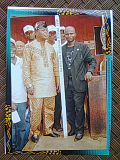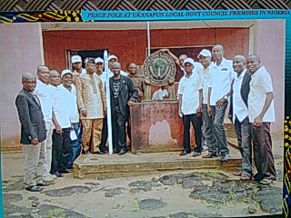 Executive Chairman of Ukanafun Local Govt on(gold color attire) Mr Mojima Etokudo on (black) while members of Ukanafun Network for Good Governance pose at Peace Pole stand at Ukanafun LGC premises planted by Mr Mojima Etokudo WPPS Rep in Nigeria.