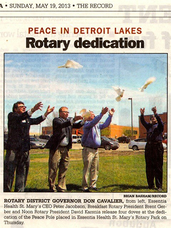 The dedication was attended by District Governor of Rotary Don Cavalier who read a proclamation declaring May 16th as May Peace Prevail On Earth Day in Detroit Lake City. At the end of the dedication, doves were released to send wishes for peace from Detroit Lakes out to the world.