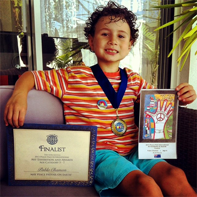 This year we had a winning sister and brother team from Australia, who entered the 16th annual Peace Pals International Art Exhibition and Awards. Natalia, age 10 came in Second Place in her age group and her brother Chamon, age 6 was one of 17 finalist in his age group. Both of the children gave us their representation of what “Peace Day” meant to them, following our theme for the International Day of Peace.