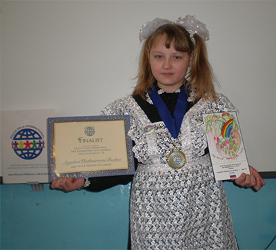 Congratulations Angelina Budina, age 10 from Russia who was a Finalist in her age group for the 2013, 16th Annual Peace Pals Art Exhibition and Awards.