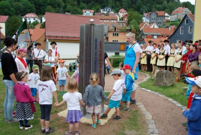 A Peace Pole was dedicated in Ruhla, Germany, with a worthy ceremony. The dedication took place on the opening day of the annual parish fair and was performed by the pastor of the Evangelical-Lutheran Church of Ruhla, Reverend Gerhard Reuther, the mayor of Ruhla, Mr Hans Ziegler, a representative of the Foundation of the Wartburgsparkasse (a local bank that contributed financial support), Mr. Joachim Press, the children of the local Kindergarten and members of the parish fair association. It was a very nice and touching experience that many local people and guests attended.