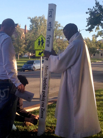 October 3rd, 2014 After a blessing for the Peace Pole inside St. Anthony’s of Padua Church and benediction, this Peace Pole was planted on the church grounds. Fr. Lucas Simango…