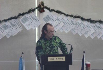 Everyone in attendance took a trip around our amazing planet, region by region, sharing and learning a little bit about what is happening with our sisters and brothers across the globe. The Ceremony took Jim exactly 2 hours of non stop narration and, during the closing remarks, couldn’t be heard over the public address system as the applause was too loud! An eight language Peace Pole was given to DuPage that will be used at numerous events on the campus, and during the Ceremony, students had a chance to write messages of Peace to go into a time capsule inside the Peace Pole. The eight languages on the Peace Pole were chosen as being the eight most spoken languages on this incredibly diverse campus.