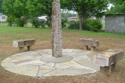 To the North it reads in the Cherokee language and alphabet. This was chosen to honor the first Native inhabitants of the Ozarks. While there were many First Nation tribes in the area, the Cherokee have their own alphabet, therefore it was chosen to honor not only the first settlers of this land, but also the suffering of the Cherokee people on the Trail of Tears.