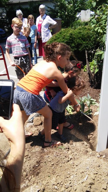 As you can see from the attached photos, we had a lot of kids participate, and in their First Day School (Quaker equivalent of Sunday school) this morning, they made little tokens of peace that we buried with the Peace Pole. Other friends buried crystals, shells, fossil, feathers, and stones in the hole.