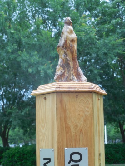 The 6-sided, 6-foot Peace Pole is handcrafted from local cedar, cypress and pine, and capped with a cypress knee (root of a Cypress tree) that takes on many forms depending on the light.