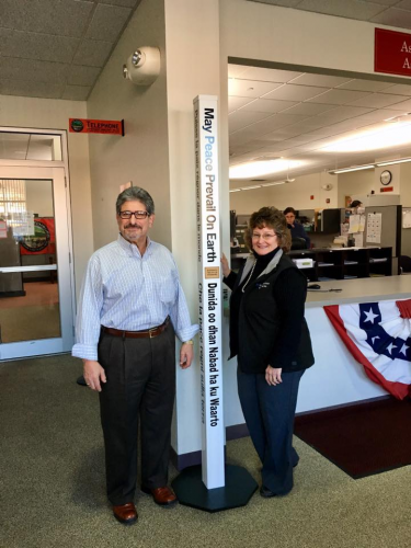City of Fitchburg Massachusetts, Mayor Stephen DiNatale and Human Rights Commission Chair, Barbara Nealon, display Peace Pole donated by Margaret Gabrelli. The Peace Pole will be featured in City Hall’s Lobby…