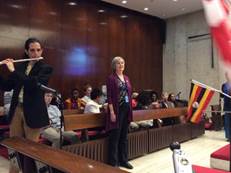 It was then time for the World Peace Flag Ceremony, which the young people introduced and implemented. Brandon Perdomo, WPPS UN Youth Representative, provided flute accompaniment, while UN Rep Deborah Moldow helped with the country names. The flags were handed to the students with care by Akiko Imaizumi and Reiko Kamozawa. Everyone present prayed for every country in the United Nations, and Deborah was introduced thank everyone and to close the ceremony by presenting the flag of the United Nations.