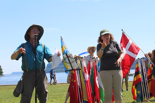 Jim Dugan, from the New York World Peace Sanctuary, has gone to the Festival for many years setting up a booth in the “Activist Area” to share our work and has been leading a World Peace Flag Ceremony each day of the Festival. This year we were thankful for the help of World Peace volunteers Carol Winters, Jackie Eaton, Sally and Andrew Damon, Haley Woodard, David Brann and Cynthia Sibusisiwe Shumba UN staff member from Zimbabwe, along with Festival provided American Sign Language Interpreters who completely signed each of the Flag Ceremonies.