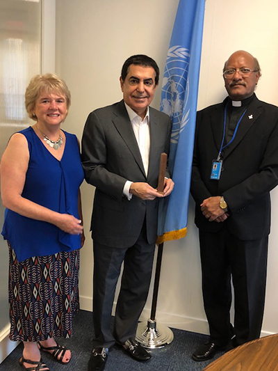 WPPS Peace Representatives, Monica Willard from the U.S. along with Fr. James Channan from Pakistan presented a mini Peace Pole to H.E. Nassir Abdulaziz Al-Nasser, High Representative for the Alliance of Civilizations at the United Nations.