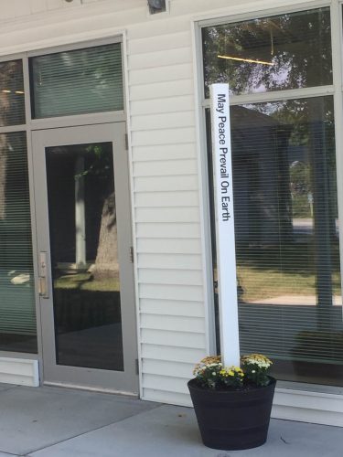 Newly Place Peace Pole on Patio for all to see languages of English, Spanish, Hebrew and Arabic.