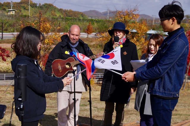 Singer-songwriter and peace activist James Twyman, who accompanied WPPS staff and friends from U.S., Scotland and Japan helped us lead the synchronized global meditation for ONE KOREA. The World Peace Flag Ceremony followed featuring students from the local Musan Sueok High School who volunteered to carrying the flags of the world.