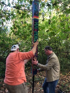 on in law, Aaron Cohen and Son David Rabow, Planting Memorial Pole behind West Hills Unitarian Church[