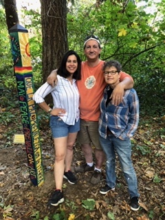 Family members, Linda Cohen, daughter, David Rabow, son and Karen Polinsky stepdaughter plant peace pole in memory of Ellen Kimball Pollens