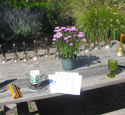 Cristina Reyes-Schleifer rung the Sanctuary Peace Gong to begin the World Peace Flag Ceremony.