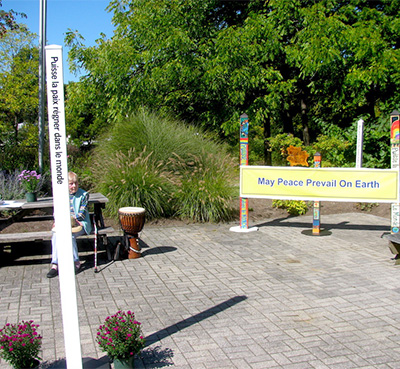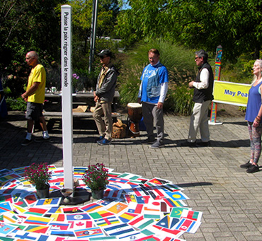 The World Peace Flag Ceremony was held outdoors on the front patio for the comfort and convenience of our elders as well. It was decorated – cheerful and festive. Both versions of the Limited Edition Peace Poles were used to hold-up the bright yellow banner, bearing our message May Peace Prevail On Earth. We then placed the flags in stands on the peripheral, with our signature “Classic White Peace Pole” as the focal point/centerpiece. We invited people to bring an offering to place at the base of the Peace Pole to hold the “energy” during the Ceremony.