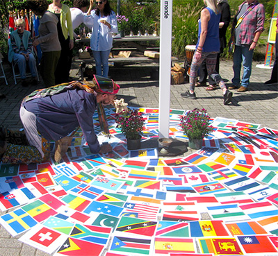 We opened the World Peace Flag Ceremony with a Native American, ”blessings to the four-directions” invocation led by Tonya Shumatoff, which included the burning of tobacco and the blowing of a conch shell horn by Echo. Dana Hawksister concluded with soft drumming. It was powerful.
