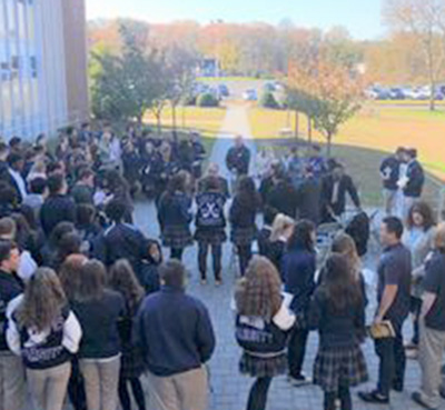 The morning started with Fr. Rick blessing the Peace Pole and the plaque honoring St. Francis. Then, Mr. Longo, head of the Capstone Academy, spoke on the benefit and purpose of being a member of the Capstone Academy at Mater Dei Prep.
