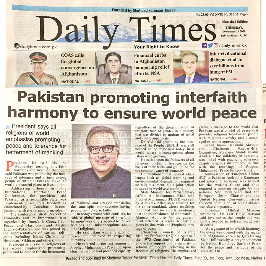 An International Interfaith Peace Conference titled “Respect of Humanity and its Importance” was held in Islamabad, Pakistan on November 24th. Chief guest of honor, President of Pakistan, Dr. Arif Alvi, along with several Ambassadors, Federal and Provincial Ministers and some 300 other religious leaders and peace activists attended the event representing the Muslim, Christian, Hindu and Sikh communities. The event was organized and hosted by Maulana Abdul Khabir Azad, Grand Imam of Badshahi Mosque.