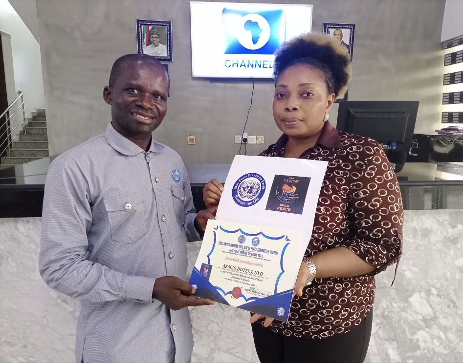 Still in the spirit of the 2022 United Nations International Day of Peace Celebration in Nigeria by May Peace Prevail on Earth International, an Ambassador of Peace Engineer Mfon Akpan the CEO of AKMAG HOTELS in Nigeria received PEACE POLE.