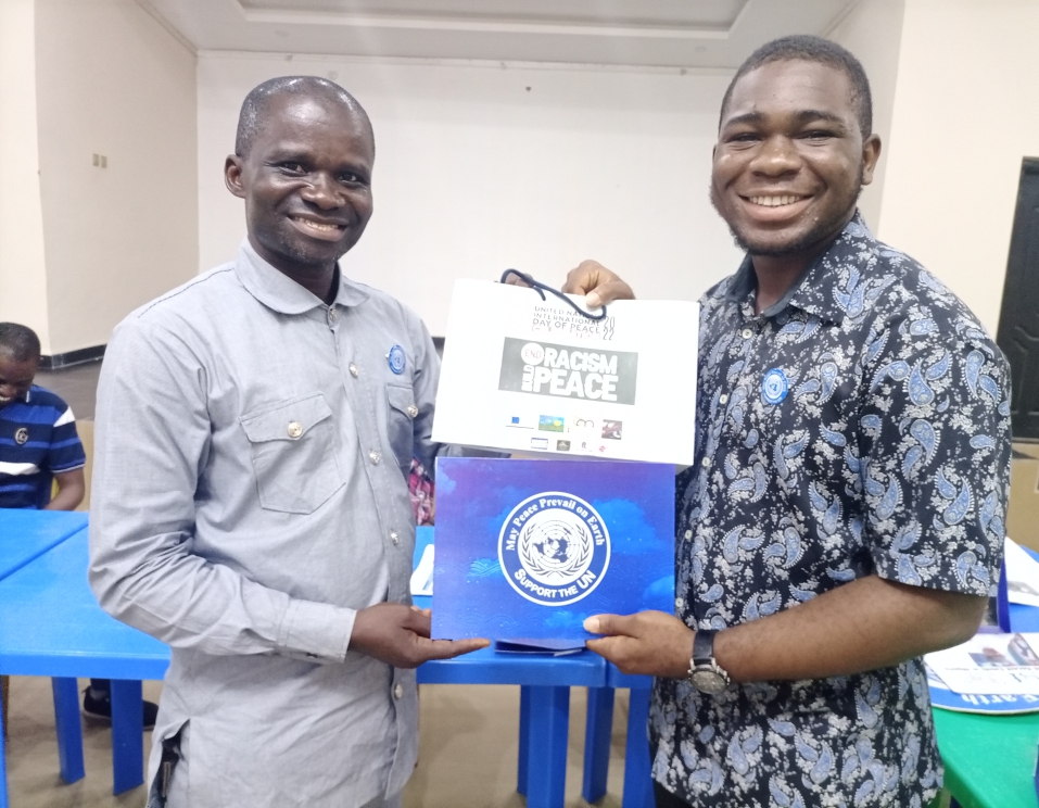 The CEO of AKMAG HOTELS in Nigeria himself an Ambassador of Peace, donated the venue for the 2022 UN Peace Day in Nigeria free of charge, received a Peace Pole alongside the manager of the Hotel. For one to use AKMAG HOTELS auditorium for a day event is worth $1,000 but we were gifted it free of charge. A Desktop Peace Pole, Certificate and Stickers was presented to the AKMAG HOTELS so every customer coming in can read the universal prayer for peace “May Peace Prevail on Earth.”