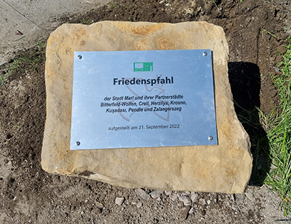 After the intensive exchange over a leisurely lunchtime snack, we continued straight to the town hall, where Mayor Werner Arndt unveiled the official commemorative plaque together with the guests at the Peace Pole. “As it is commonly known, Peace Poles exists in around 250,000 cities worldwide. In Marl we would like to set up another duplicate every year in exposed places. And maybe we can encourage our partner cities to do the same,” says Werner Arndt.