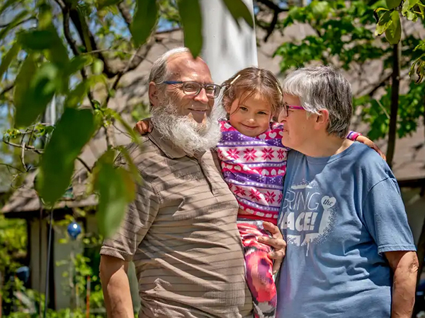 Rod Maust, his wife, Martha Yoder Maust and their granddaughter, Nuria, show the gardens at the Mausts’ Herron-Morton Place home.