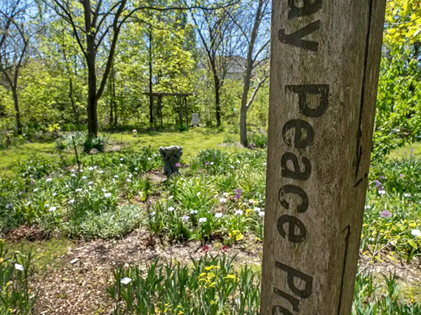 A Peace Pole adds to the peace of Rod Maust and Martha Yoder Maust’s gardens at their Herron-Morton Place home.